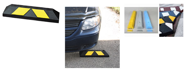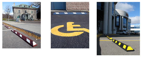 Parking Blocks come with pre-molded holes and can be shipped with anchoring spikes or lag bolts for installation. They are lightweight (34 lbs. for a 6' car stop) and flexible; conforming to the contour of uneven road surfaces.