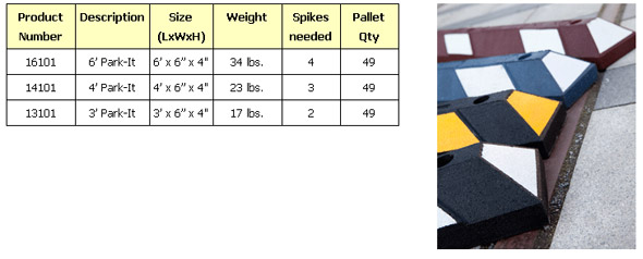 Park-It car stops are available in 22", 3', 4', and 6' lengths and are covered by a 3 year warranty.