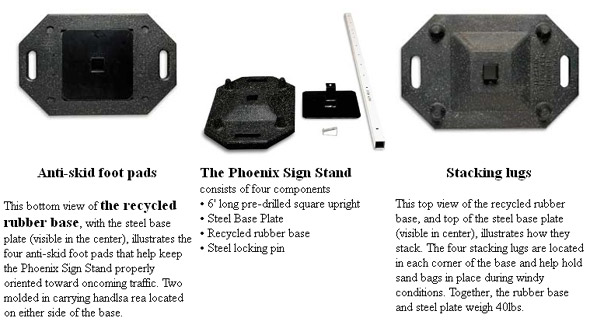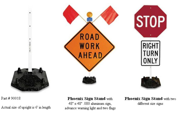 | Tested and certified to meet the crashworthy requirements of NCHRP-350 . At last, a simple and easy way, to mount signs that are different in size and shape to ONE sign stand. The new Phoenix Sign Stand is designed with a pre-drilled square upright to accommodate hole patterns found in most size signs. You can raise and lower signs anywhere along the six-foot long upright for more flexibility.