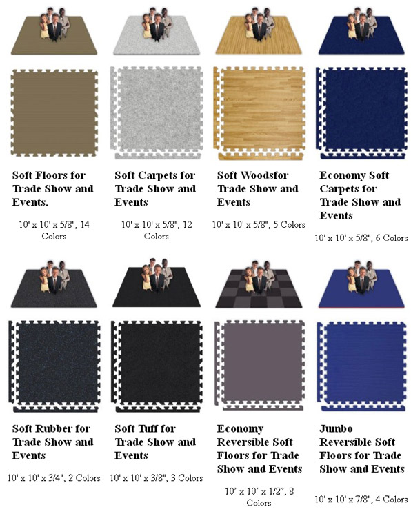 Create any size Solid, Checkerboard or Mix-n'-Match floor with any Soft Floors, Soft Woods, Soft Carpets, Economy Reversible Soft Floors, Economy Soft Carpets, Jumbo Reversible Soft Floors, Soft Tuff, or Soft Rubber for the most comfortable and affordable Trade Show and Event flooring you can buy.