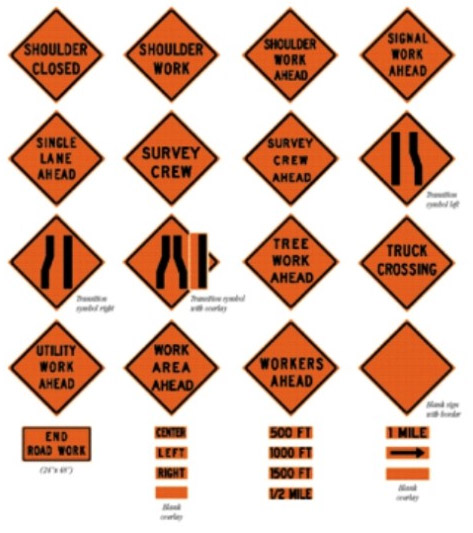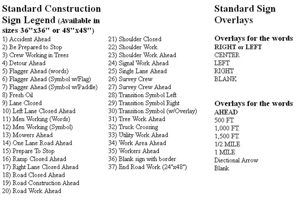 Traffic Devices offers a wide range of standard sign legends in 36" x 36" and 48" x 48" sizes, as well as, a variety of sign materials. There are no minimum run or special screen charges for any of these standard signs and overlays. Roll-up construction signs come in a variety of different materials and legends as illustrated below. These signs utilize pultruded fiberglass crossbracing or ribs along with a variety of corner pockets to achieve maximum performance, even in the windiest conditions.