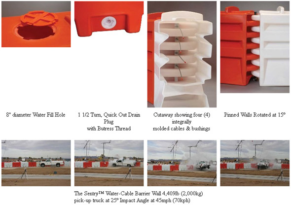 - The SentryT Water-Cable Barrier Wall has been tested and passed all TL-2 & TL-3 light weight 1,807lbs (820kg) and heavy weight 4,409 lbs (2,000kg) impacts at 45mph (70kph)and 62.5mph (100kph) impacts.