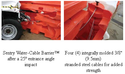 - Integrally molded into the SentryT are four 3/8" (9.5mm) diameter stranded steel cables, galvanized for corrosion resistance. These (4) cables prevent the impacting vehicle from penetrating the barrier wall. At each cable end is a corrosion resistant steel bushing.